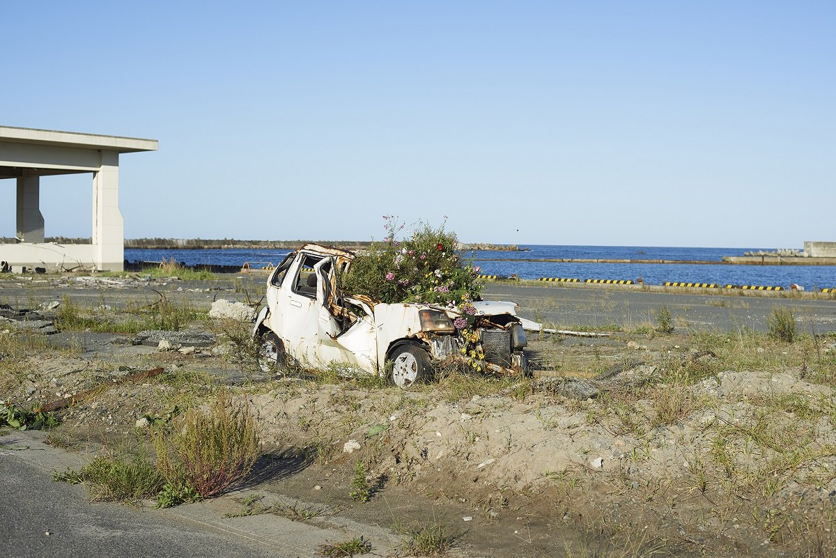 Flowers, fresh and vibrant, reaching outward from the past. Symbolizing continuation of life and the possibility of our future – Similarly, in the way those whose worlds were caught up in this disaster have undergone a rebirth of their own since then. Their towns, also reborn. Despite starting from a past, a time, a place of broken memories.
