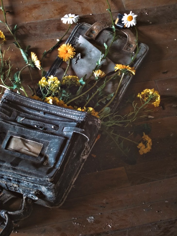 Together the flowers and the items they’re placed in convey how delicate we – and our way of life is. The flowers are reminders of lives that once inhabited these items. The people whom these items belonged to. Fragile bodies, like flowers. So quickly can it be washed away. Like petals blown away in a fast wind.